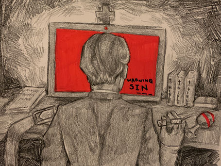 My theme was based on my religious trauma and others’ common religious trauma. The focus is on the corruption and unethical behaviors of the church that ironically worshipped goodness. Lighting and color schemes are dramatic, as if they are visual representations of themes of evil, depression, or simply sin. With each piece, I explored different media to express my theme, switching from colored pencil and markers to louder media like oils, while incorporating the original bold color motif. Each piece of work incorporates different values, specifically contrast, the rule of thirds, and hatching. Monotones are used to emphasize emotion and dark vs. light.